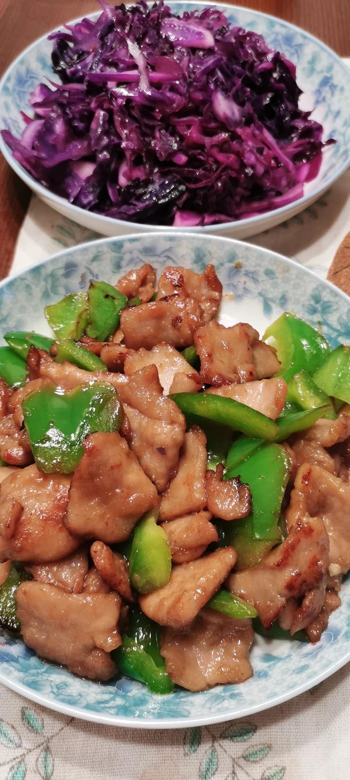 lovejay1_cn1 做过 晚餐•2023年5月8日 甜椒炒肉片(肉片+甜口烤肉酱汁+一丢丢小苏打+淀粉+油抓匀,腌半小时)+清炒紫甘蓝+红烧肉烧素鸡烧蛋烧杏鲍菇#晚餐•2023年5月8日# 2023-05-08
