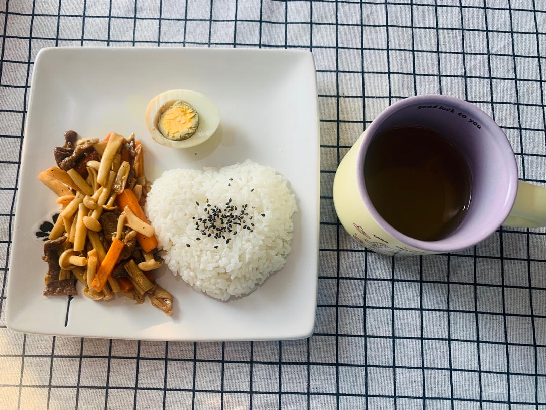 奥尔良牛肉炒胡萝卜海鲜菇,茶叶蛋,茉莉茶