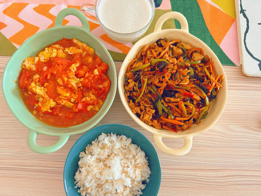 西红柿鸡蛋、鱼香肉丝(鸡肉)、1:4的糙米饭