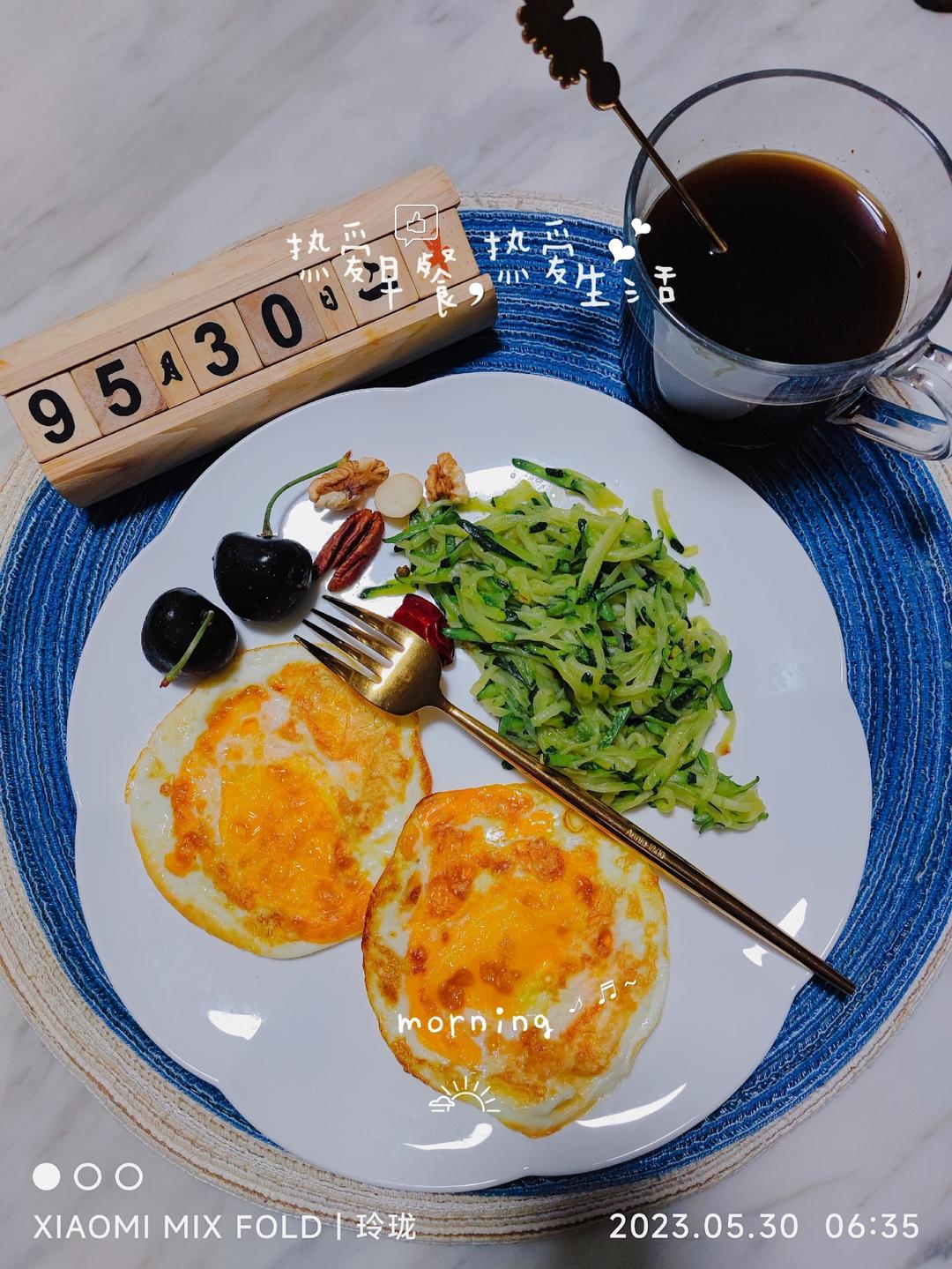 玲珑厨房故事 做过 早餐•2023年5月30日 大王的减脂餐【早餐】🍒2个车厘子☕250ml黑咖啡🥚2个煎蛋🥬100南瓜丝🌰10g核桃仁+夏威夷果+碧根果#早餐•2023年5月30日# 2023-05-30