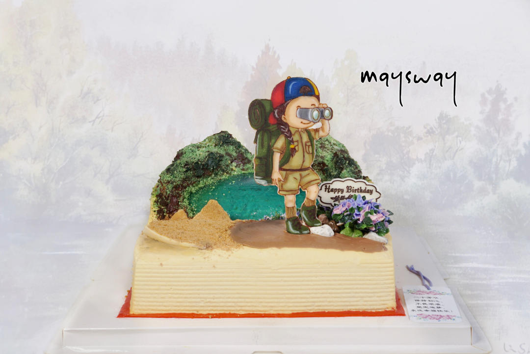 从还是个小姑娘开始,她妈妈就在我这里订生日蛋糕了,感谢❤❤❤。今年20岁,妈妈说:“希望她保持初心、不畏艰难、坚定追梦,永远幸福快乐”。我想,人生要获得智慧和勇气有三大途径:读万卷书、行万里路——它们从深度和广度无限拓展我们的人生;第三个是爱——爱能战胜我们无法想象的困难。于是我设计了这个蛋糕,结合了读书和行走,并将母亲的寄语做成书签附上。愿你所有美好的梦想成真。