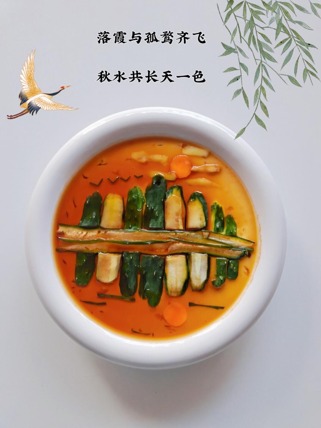 今天就以这名句做一道山水画鸡蛋羹吧,就用鸡蛋羹、青瓜、胡萝卜、酱油来作成这一幅画,没想到普通的食材也能秒变一幅山水画❗