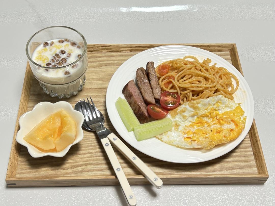今日早餐:奶粉麦片,鸡蛋,牛排,番茄意面,蜜瓜。