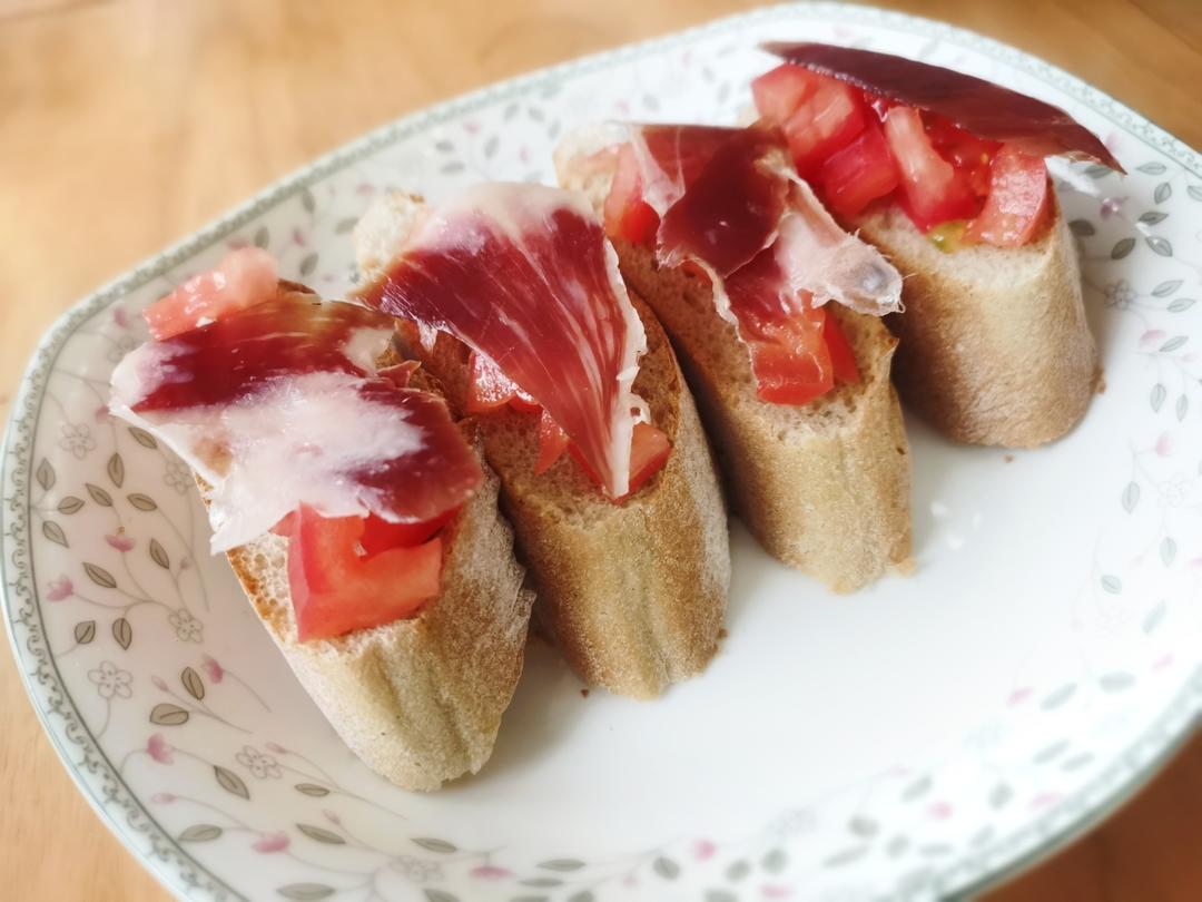 可爱同事妹妹送的火腿,垫一层番茄丁,配上奥乐齐的法棍,还是不错的,但妈妈不是很习惯这个,怕吃生冷的闹肚子~