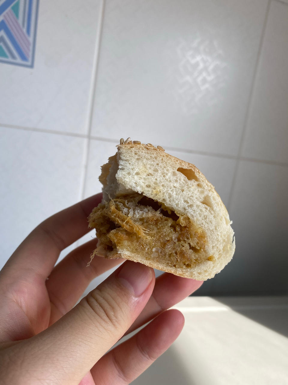 冷藏了3天的面团,口感比较扎实,大黄米肉松馅,肉松跟大黄米应该分开,不要混合在一起