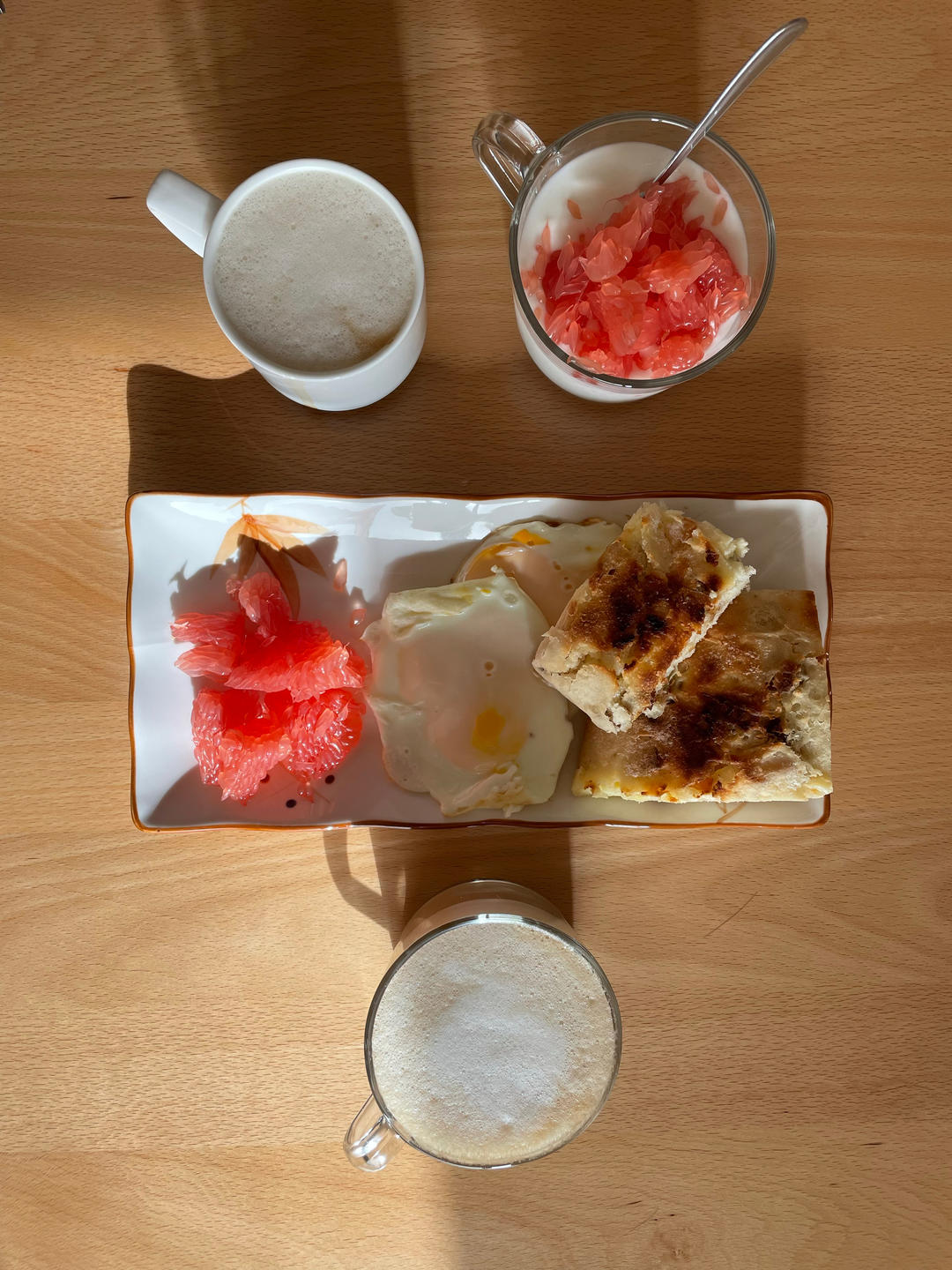 奶酪面包+无油煎蛋+西柚+无糖酸奶+(聊胜于无的)燕麦拿铁——虽然阳光大概率意味着又是烤火的一天,但至少能让餐桌显得多一点明媚🙈