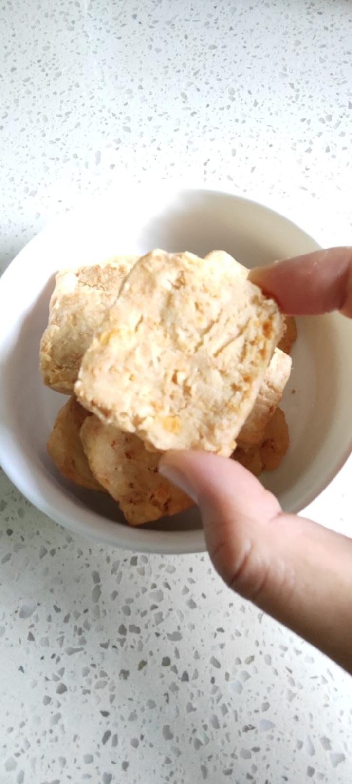 我喜欢清迈 做过 巨香❗️无需打发❗️拌一拌做咸味蛋黄肉松曲奇 吃了一块还想吃第二块,一份可做半条模具 我切得有点厚,真难切,前两次一切就散了,冻冻再切。刚出炉时像软曲奇,凉了就酥脆了。用的咸蛋不咸,可适量加半勺盐增加咸味,下次吧! 2023-07-14