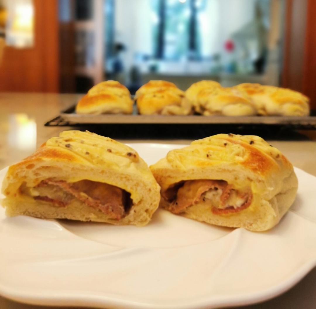 虽然没有模具,做出来样子比较扁平,但是一点不影响口味,面包体松软,馅料中帕斯雀牛肉和黑椒芝士白酱的浓郁以及芝士片的奶香交织在一起,让人非常满足。