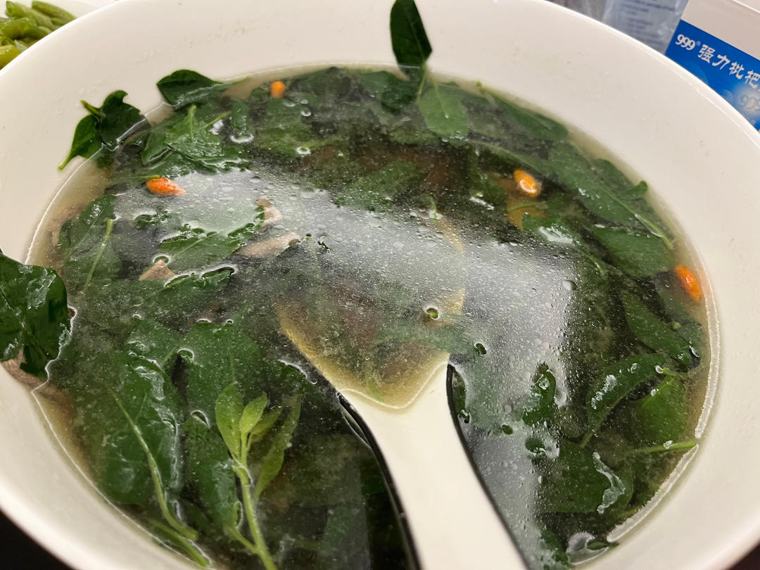 heiheida 做过 枸杞叶猪肝汤 300g猪肝洗干净浸泡30分钟,枸杞叶每颗冲洗干净,浸泡10分钟,取出摘叶子沥干。猪肝切片,多洗几次,加入生姜,料酒/白酒,生抽一勺,玉米淀粉10克腌制。 油锅放生姜,水煮沸,加枸杞,加猪肝,定时2分钟,剩1分钟加枸杞叶,加盐巴,尝味道,加鸡精。 2023-07-26