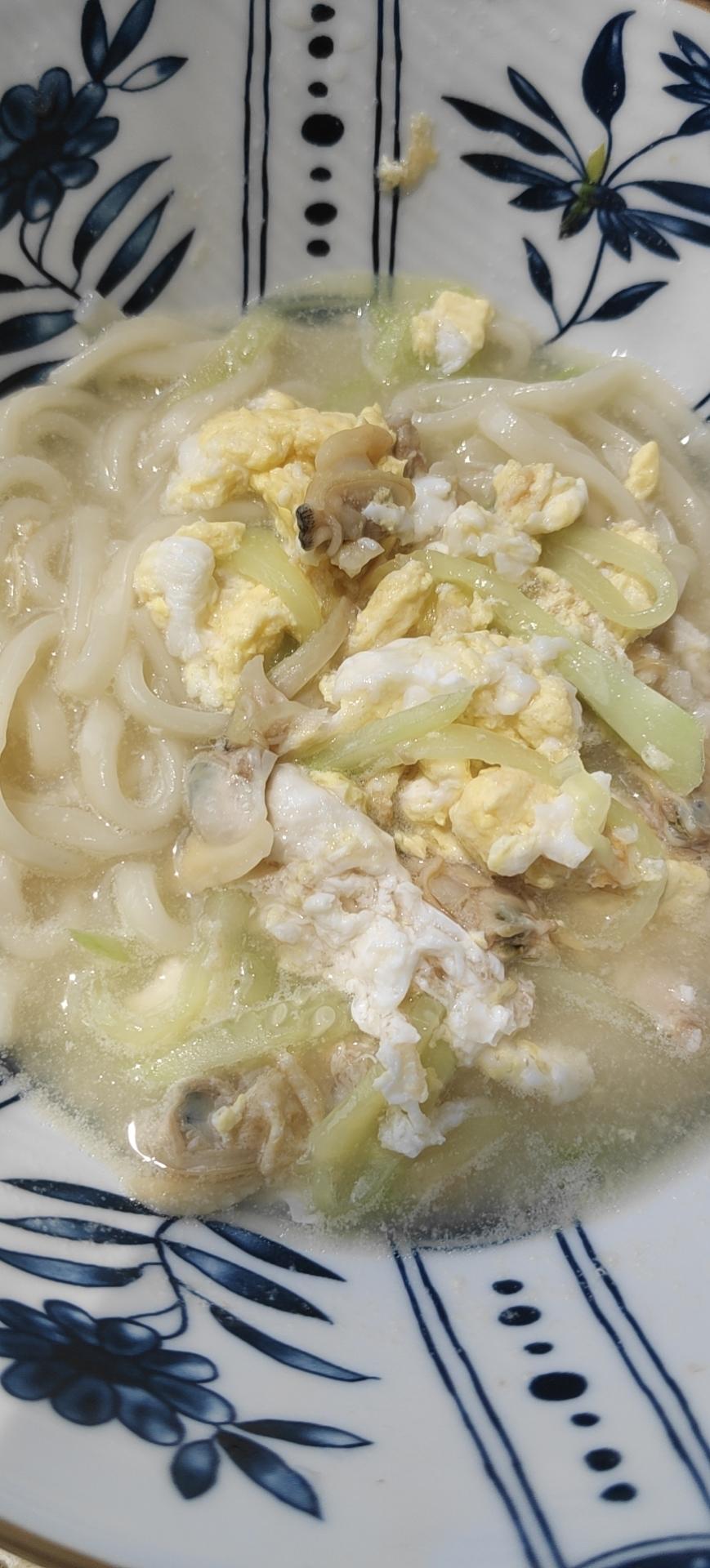1.煎鸡蛋,加水,加蚬子,面,黄瓜丝