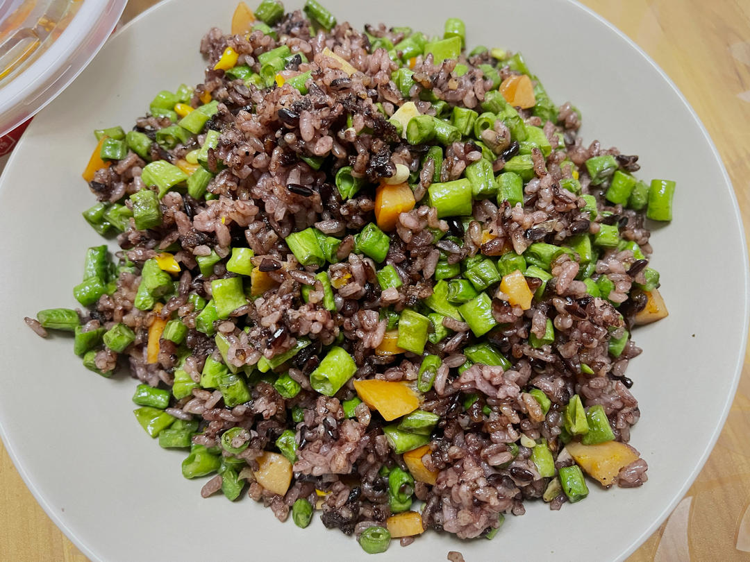 剩饭是黑米,配上豆角,颜色还行
