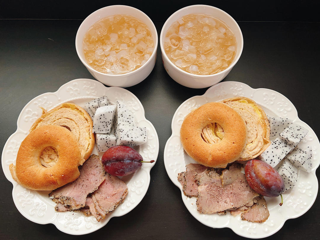 sharon蓝9911 做过 8月早餐马拉松 8🈷️好 Day1早上好 🌦今日早餐海盐芝士全麦贝果,牛肉片,椰果银耳汤,火龙果&西梅Lin先生换新公司啦,今天第一天报道,希望他在新公司也能发光发热☺️这周我们先试一下提早出门,要是都太累,那我就回曾厝住咯 #唯有爱与美食不可辜负# 2023-08-01
