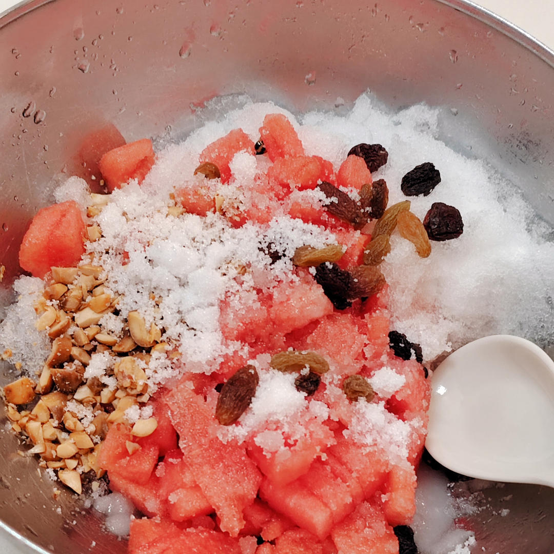 西瓜刨冰🍧西瓜,白开水冰,白糖,山楂,瓜子仁,葡萄干,花生碎