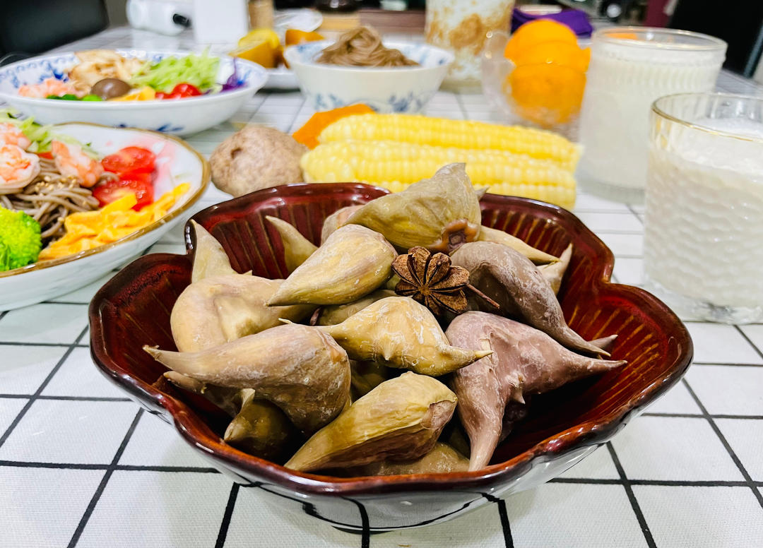 B妈小厨 做过 盐水菱角 20230806 星期日 农历六月二十寻常的日子依旧。天空是你的,阳光是你的,心情是你的……早餐自己创新的凉面配上鸡胸肉,蛋皮、虾仁🍤黄瓜🥒丝、西兰花🥦、紫甘蓝小番茄🍅撒上芝麻和自己卤的鸡蛋盐水煮菱角蒸玉米🌽南瓜猕猴桃🥝#早餐•2023年8月6日# #菱角# 2023-08-06