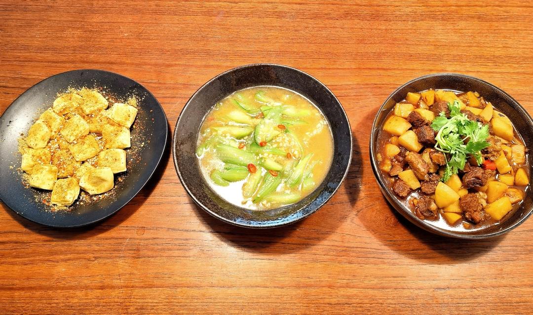 红烧牛肉炖土豆 蒜蓉丝瓜 包浆豆腐 下饭😊