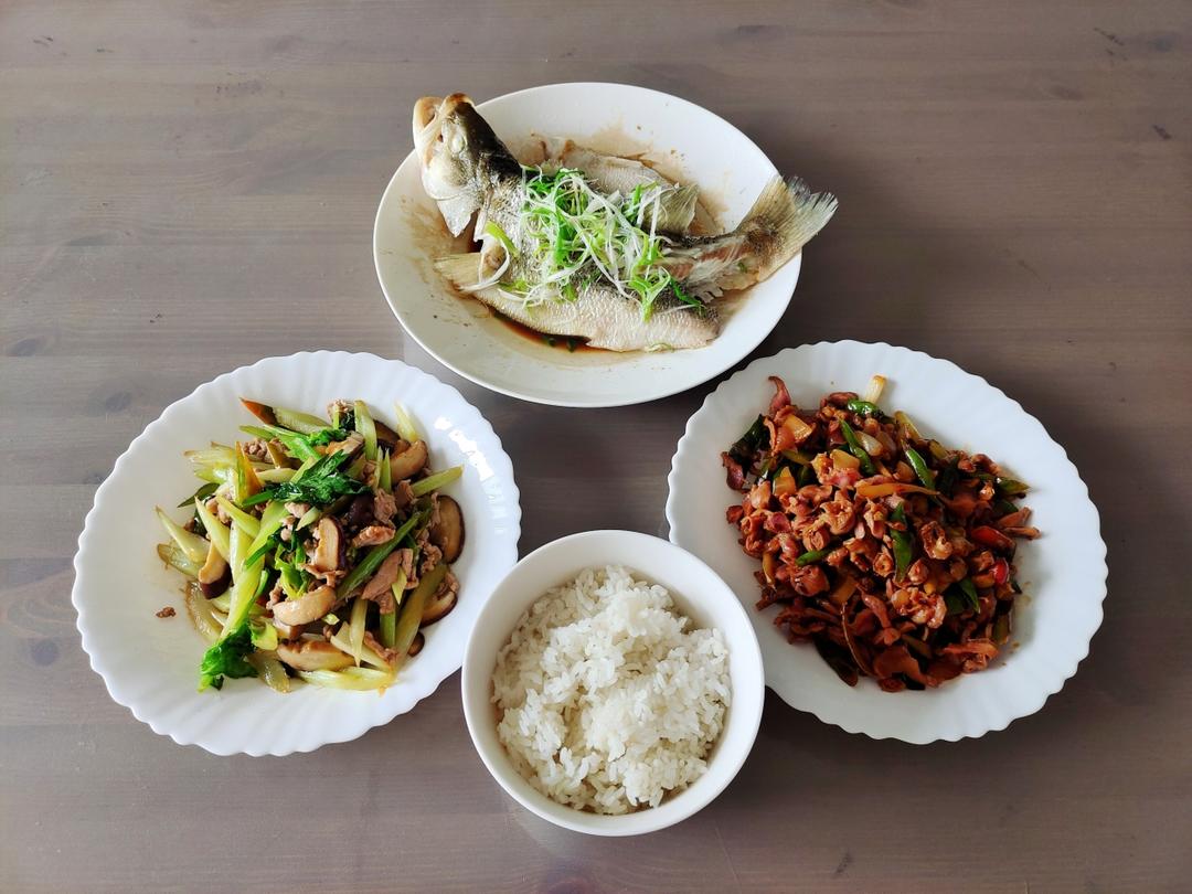 蒸鲈鱼 炒鸡胗 芹菜香菇炒肉丝 米饭🍚