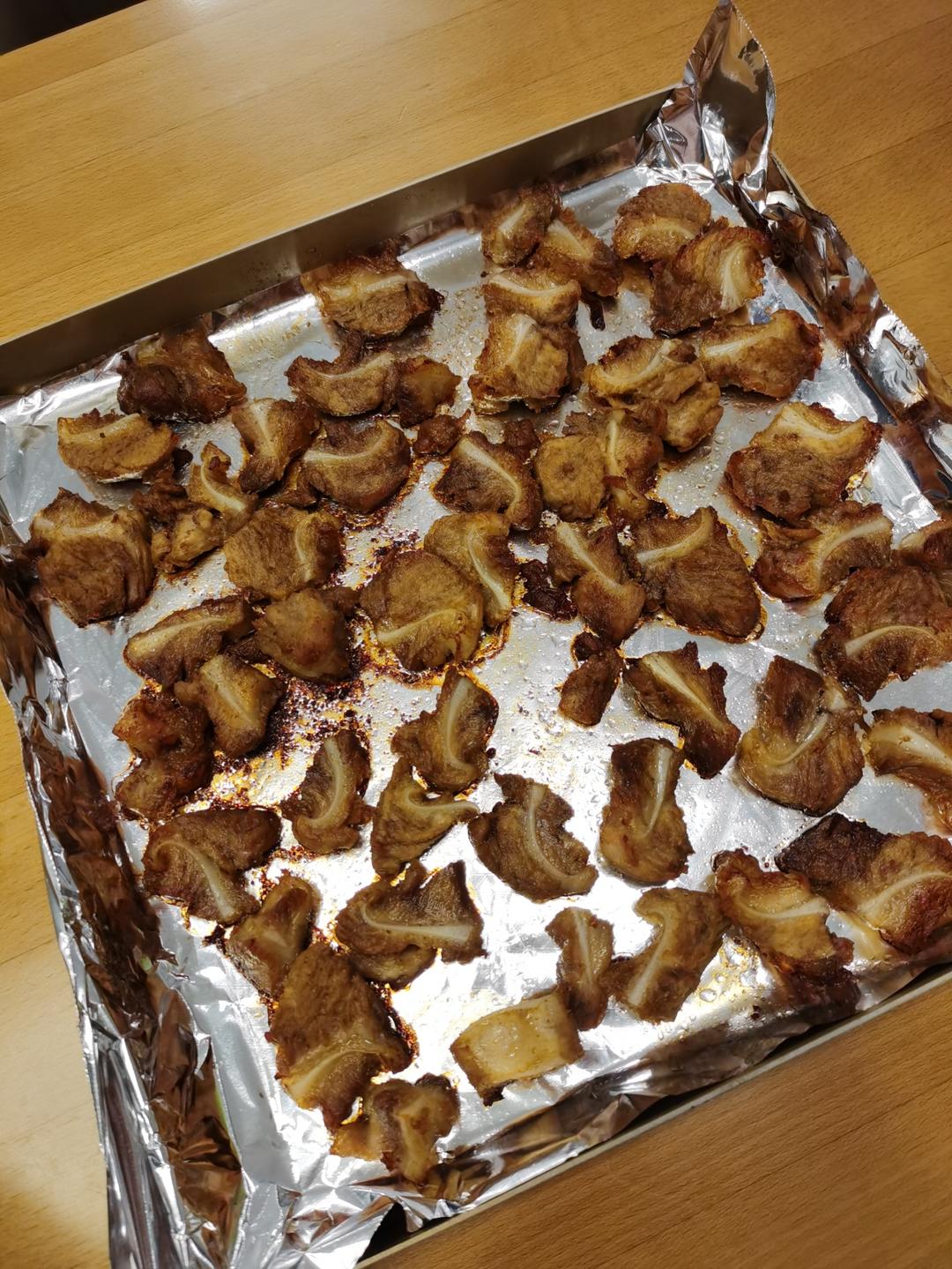 今日晚餐:孜然烤脆骨,炒包菜,海带汤。