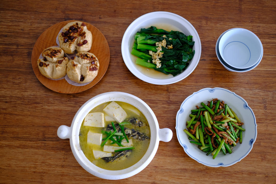 黄骨鱼豆腐汤|蒜苔肉丝|白灼菜心|红糖馒头