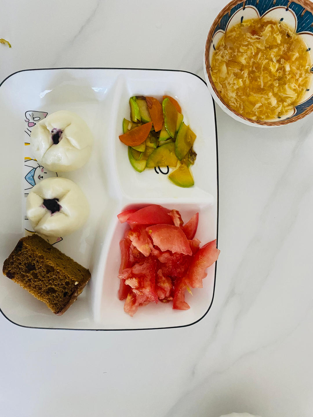 乐美妈咪 做过 早餐•2023年9月21日 #早餐•2023年9月21日# 姐姐的紫薯包,核桃糟糕,炒西葫,糖拌西红柿,西红柿鸡蛋汤;弟弟的米饭拌海苔,核桃糟糕,炒西葫,糖拌西红柿,西红柿鸡蛋汤 2023-09-21