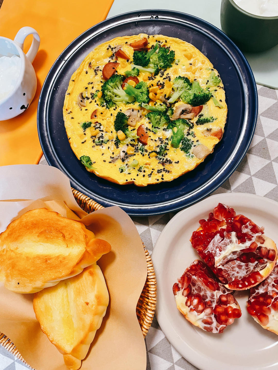 红肠蘑菇西兰花玉米粒芝麻鸡蛋饼,这可太香了😋