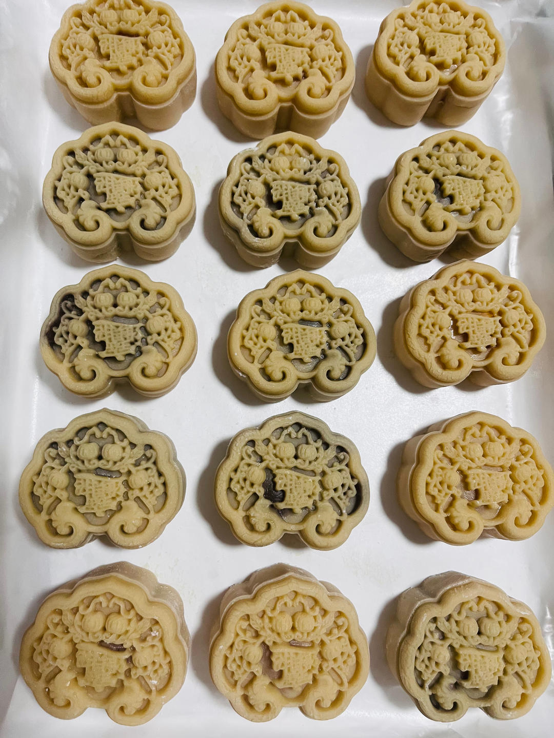 来追加啦,跟着食谱炒了莲蓉馅,豆沙馅,烤的时候老担心自己炒的能不能烤好,结果一点问题也没有,太好了,很好的食谱,太赞了