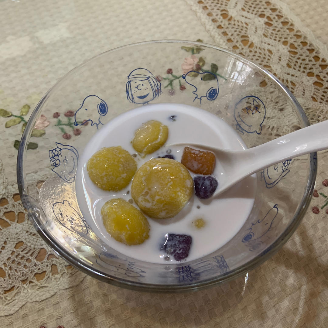 用料:汤圆、芋圆、西米、纯牛奶
