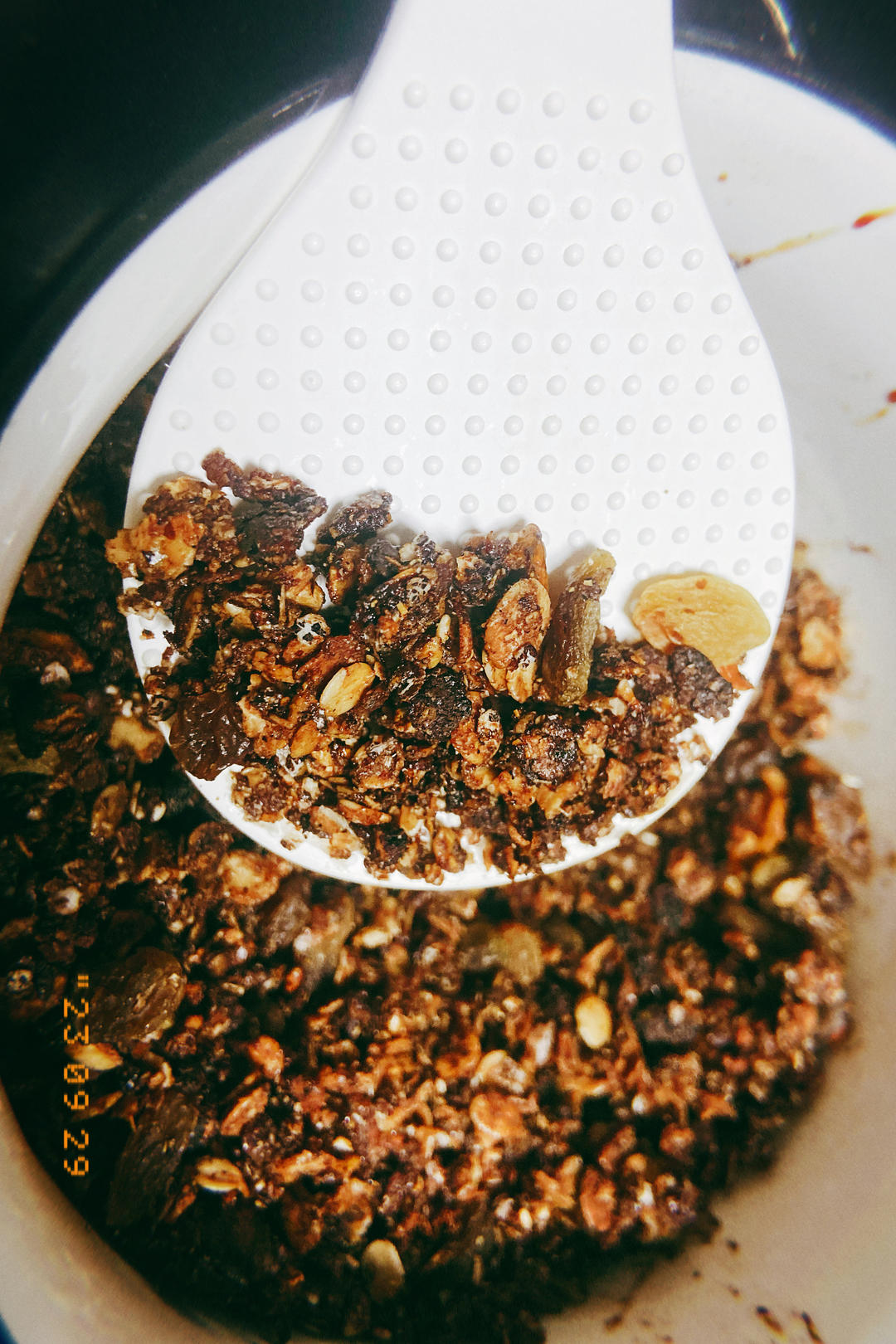 荷包蛋水母君 做过 格兰诺拉Granola麦片 空气炸锅版(ref.广坦) 加了肉桂粉、可可粉、红糖粉进去。搅拌结块的关键是油,我一开始以为是蜂蜜,所以放多了有点甜。烤好之后油会被吸收掉又变成一颗一颗的状态了,真好吃! 2023-09-29