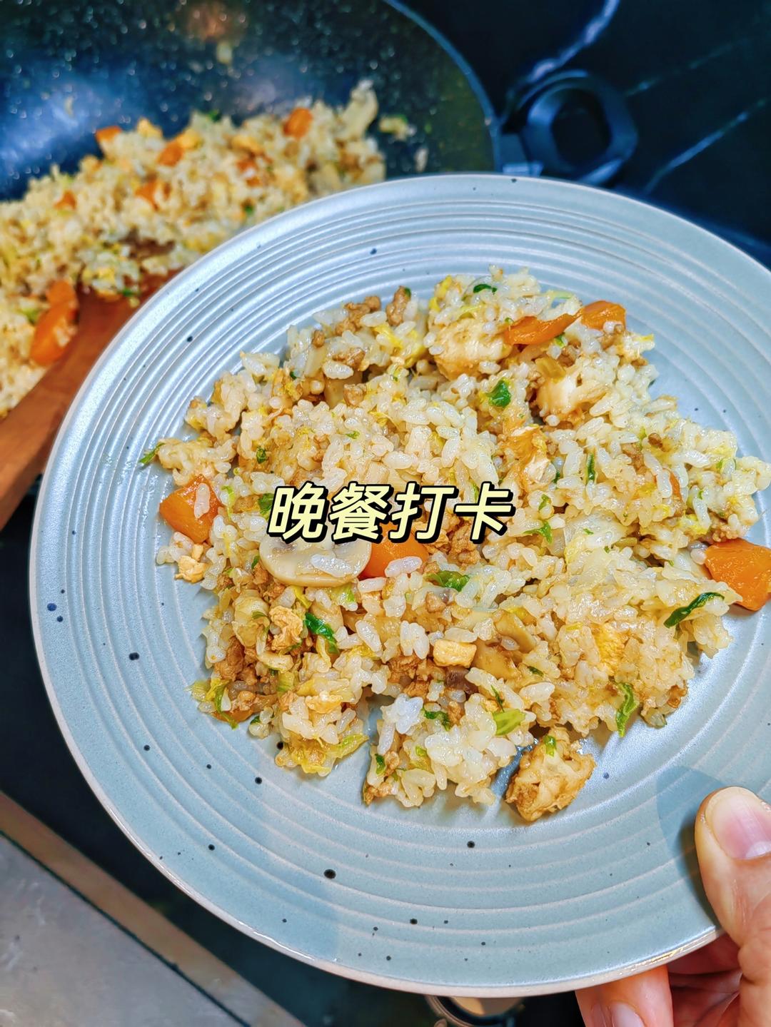 肉末虾仁蘑菇娃娃菜胡萝卜杭白菜蛋炒饭