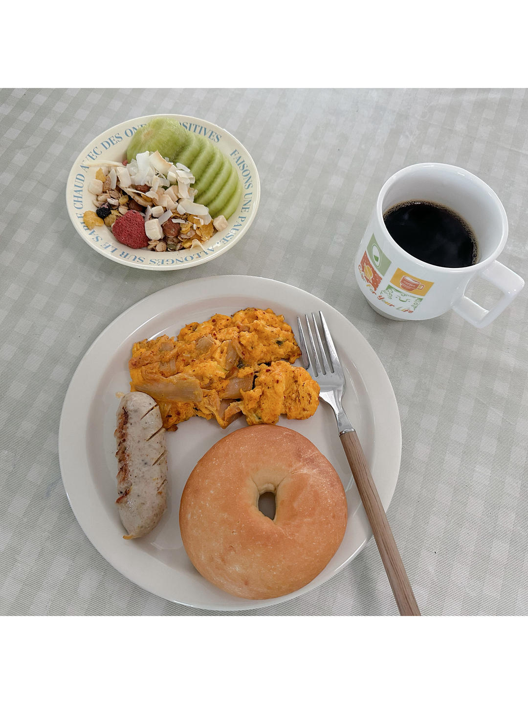 米面包、泡菜炒蛋、香肠、酸奶碗、咖啡