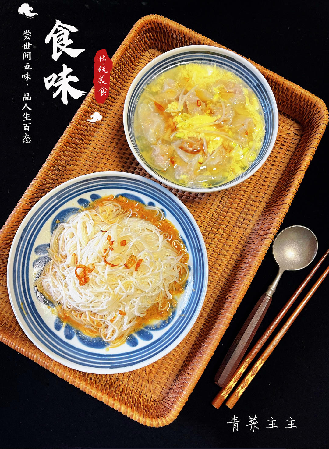葱油花生酱拌面线+鸡蛋扁食汤