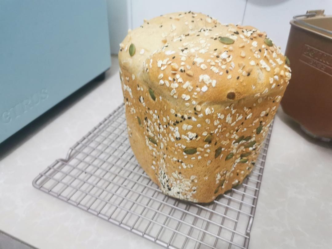 lulu-lu 做过 11月早餐马拉松 第一次做25%的全麦吐司,外面粘了谷物~面包机做的,配方搞错了,水量多放了60克,搅拌的时候成了糊糊才发现,加了100克粉才救回来,但是🍞已经变得太大了,烤的时候顶上了果料盒😂😂,还好都顺利脱模 2023-11-06