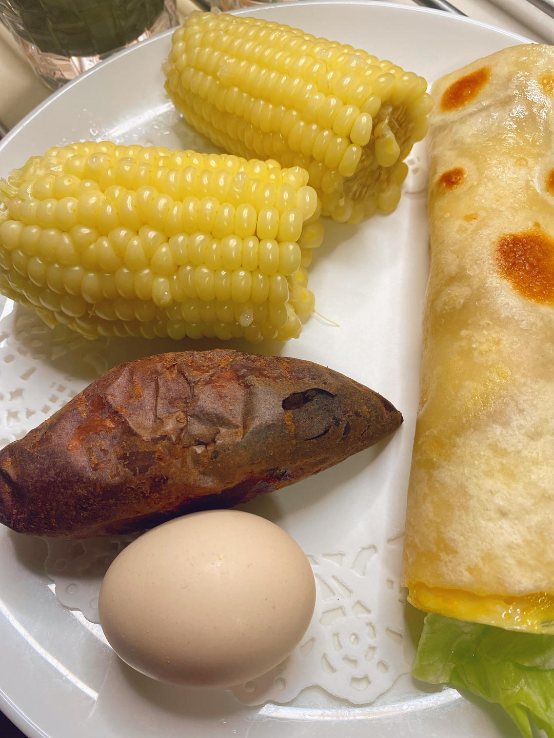 鸡蛋🥚,烤地瓜🍠,玉米🌽,豆浆,鸡蛋卷饼
