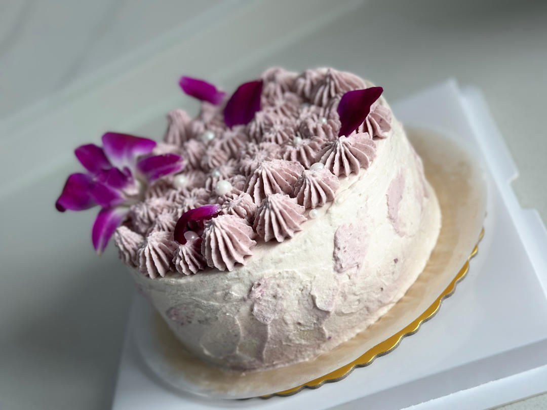 朱朱侠yes 做过 鲜芋泥蛋糕 好闺蜜过生日,鼓起勇气做一个芋泥蛋糕!用了其他方子海绵蛋糕三片。奶油打发的碗冰箱速冻一会儿,270g安佳淡奶油打发到9分,倾斜碗不流动。我的紫薯粉颜色做不到方子那么色差,所以自由发挥把洋兰做显色装饰😇芋泥是之前自己做好速冻拿出来解冻的,200g熟芋泥。抹面水平差,边上就随意发挥了。闺蜜说配色喜欢,侧面有艺术感,我很欣慰😃😃这是我做的第三个蛋糕,慢慢学习和摸索✌️ 2023-11-08