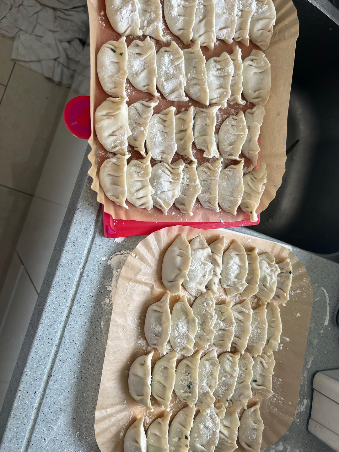 _valen 做过 立冬 从800克面粉,400克水,300克猪肉,180克牛肉,芹菜半袋,木耳若干,韭菜半袋,鸡蛋两个,共做了118个饺子🥟。韭菜蛋猪肉和芹菜木耳猪肉馅儿。韭菜事先用油拌一下或者炒一下,防止出水。肉馅料用油烧开浇花椒粉和葱。加入酒 酱油 糖 耗油 盐。#立冬# #晚餐•2023年11月8日# 2023-11-08