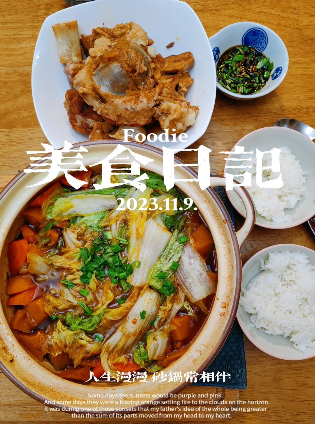 满小满的美食厨房 做过 晚餐•2023年11月9日 美食时光刮风降温天,当然要吃砂锅炖菜啦!用电压力锅提前炖好腱子肉棒骨,用骨头汤煮了南瓜胡萝卜大白菜,汤鲜,菜美肉烂糊还有骨髓吸。省事,好吃,有营养,还暖和。还没来暖气的冬日餐桌,真的顿顿离不开砂锅啊!#晚餐•2023年11月9日# 2023-11-09