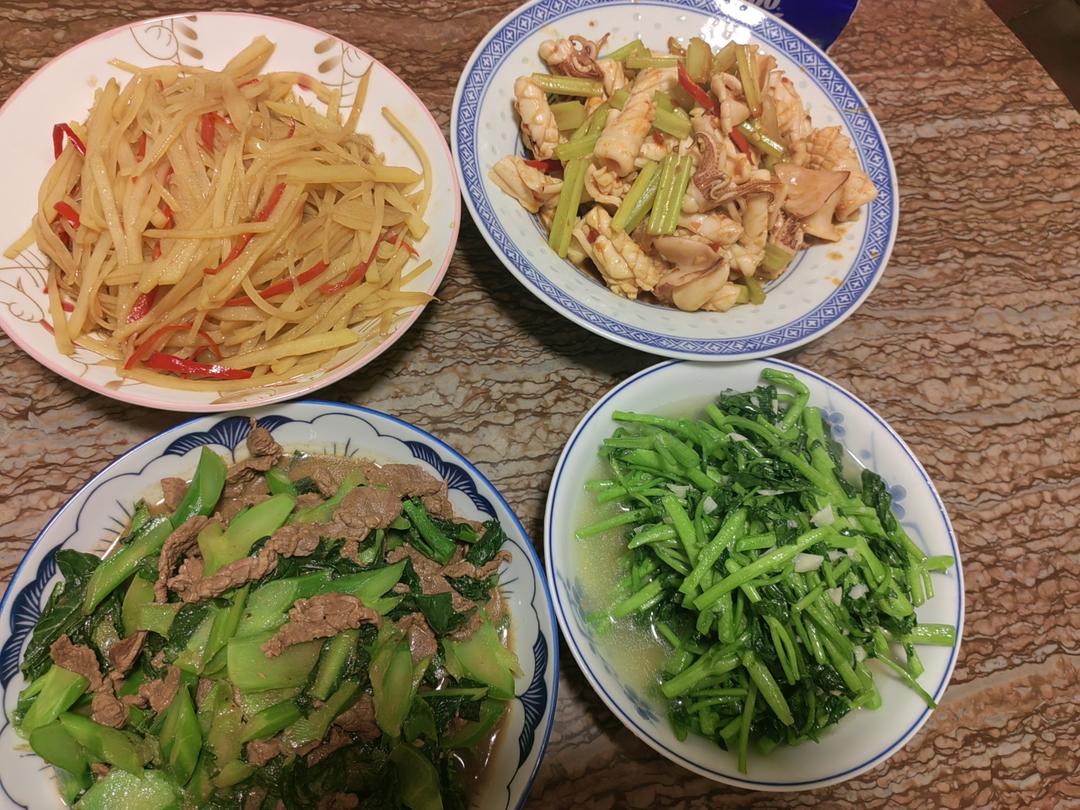 土豆丝 炒鱿鱼 芥兰炒牛肉 炒西洋菜