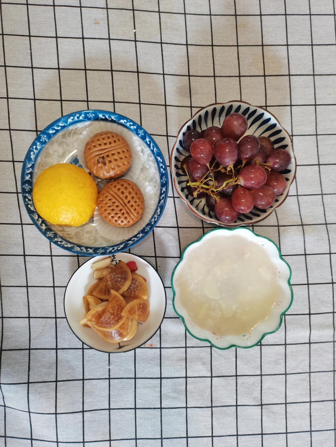 淮山瘦肉粥,核桃包,南瓜馒头,酱萝卜,葡萄