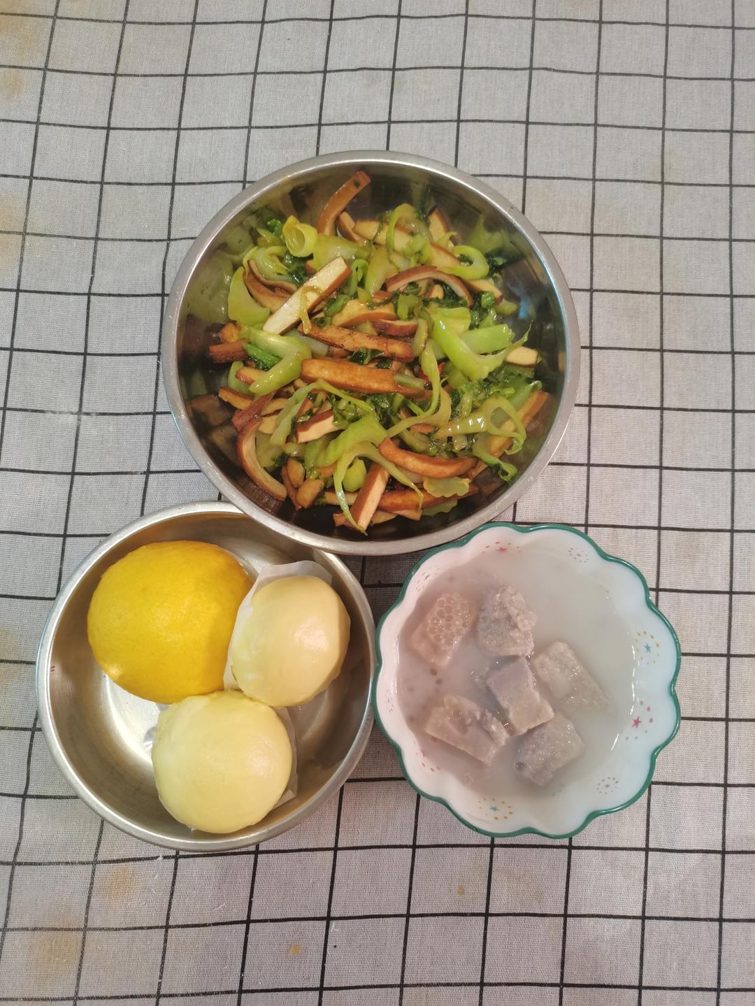 南瓜馒头,奶黄包,豆干炒芥菜,芋头西米露