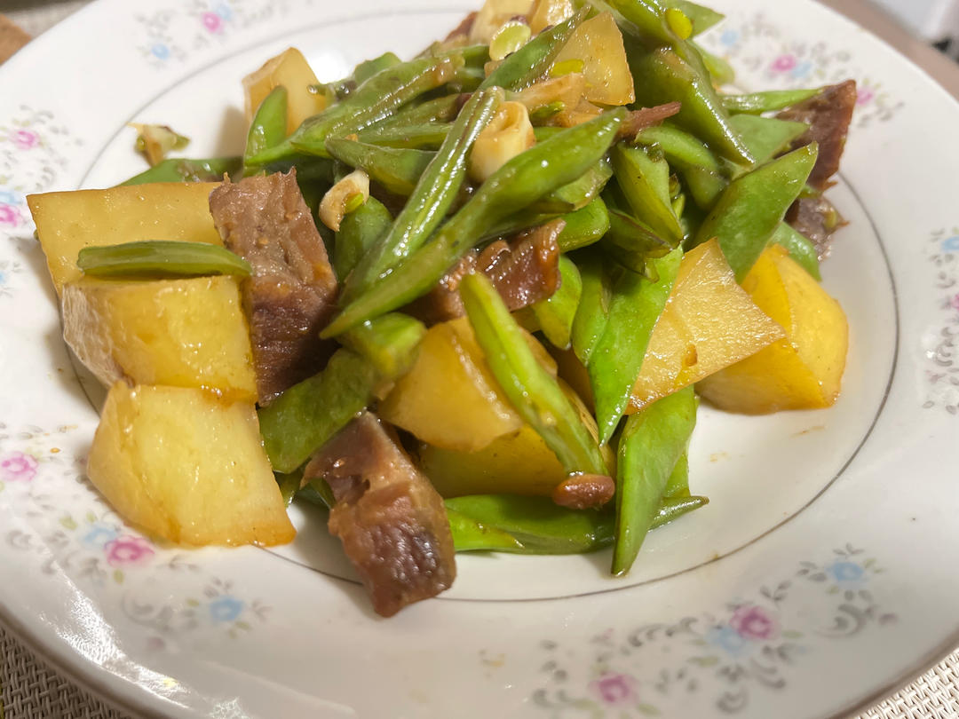 开始没焯水,但土豆事前蒸过,用的扁豆和酱牛肉。