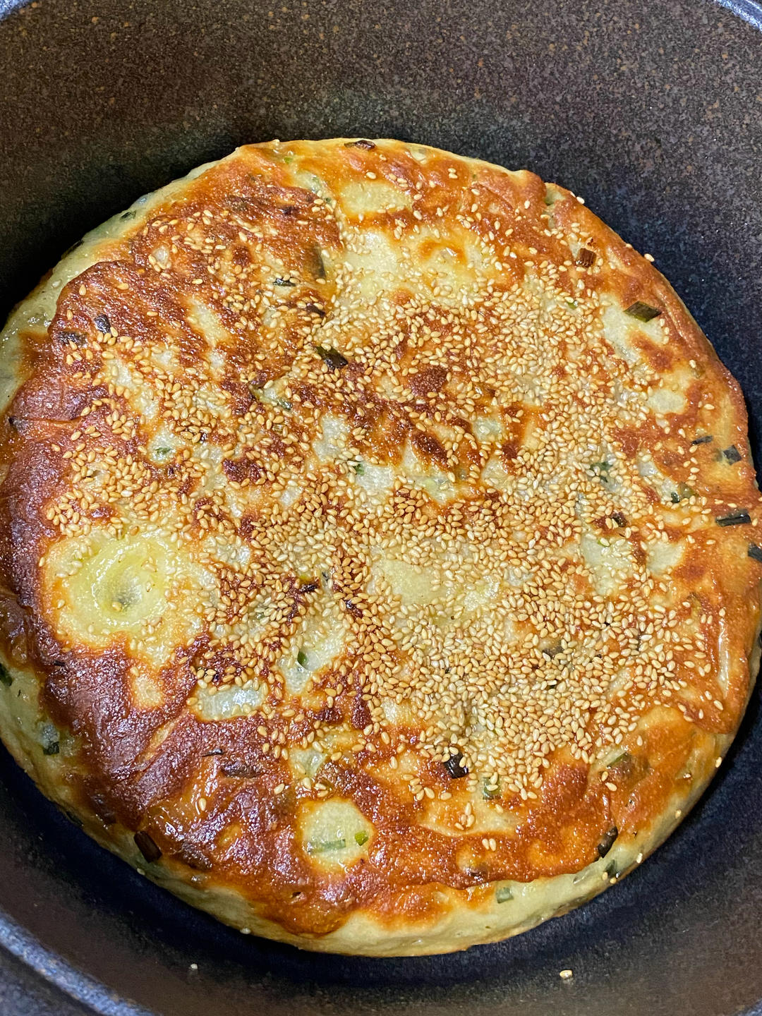 26寸平底锅,锅底和锅壁抹多一点油,倒入面团,刮刀推平面团,撒白芝麻,用刮刀压一下使芝麻嵌入面团。盖盖继续发酵15分钟,面上有小气泡。