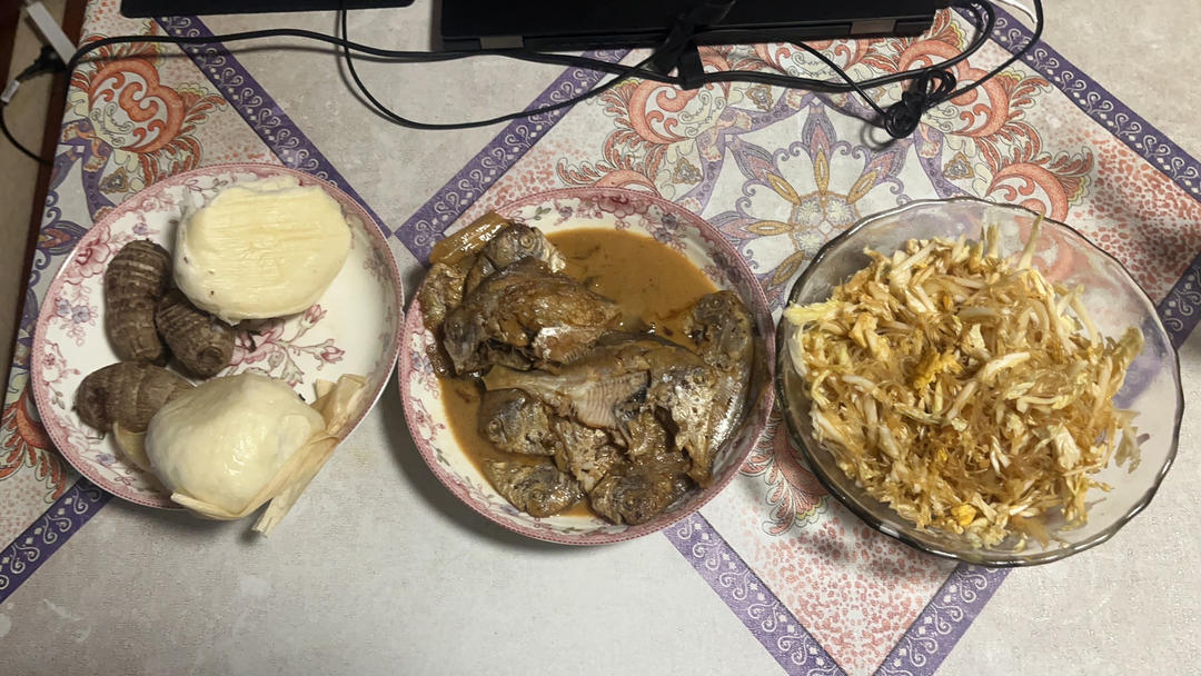 今天居家办公,一个人的午饭,红烧鲳鱼,白菜心拌粉丝鸡蛋,馒头,芋头