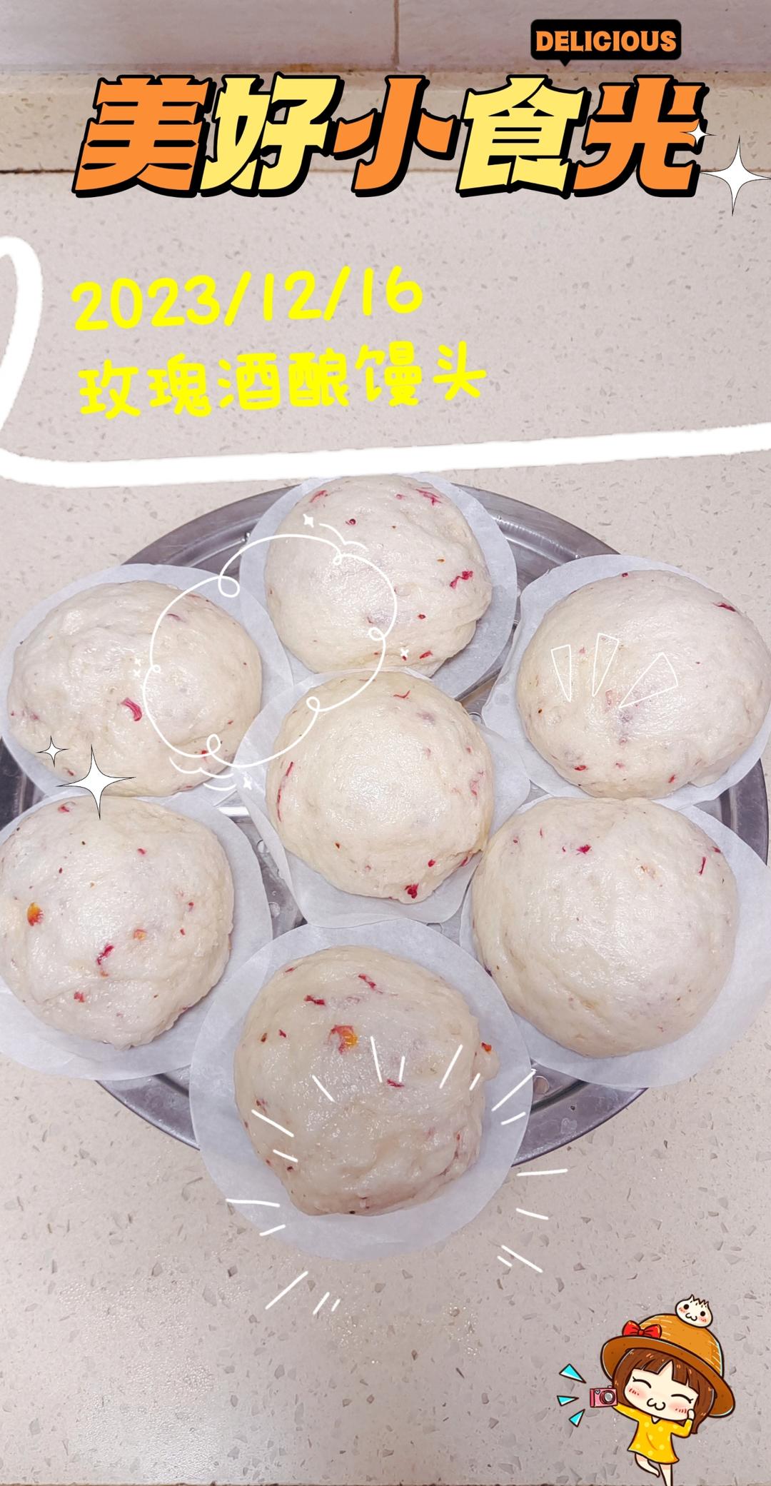 小昕妮妮 做过 酒酿馒头👍一次发酵超级松软 心心念念的酒酿玫瑰馒头~第一次做,觉得成功了。记录下:面粉275克,酒酿150克,牛奶30克,玉米油10克,糖10克,酵母3克,重磅玫瑰花5朵。面团重量468克,分8个面团,约60克一个。一次发酵,蒸锅内烧两分钟的水后关火,发酵大约两个小时,大火蒸15分钟。玫瑰混着酒香~太治愈了~#午餐•2023年12月16日# 2023-12-16