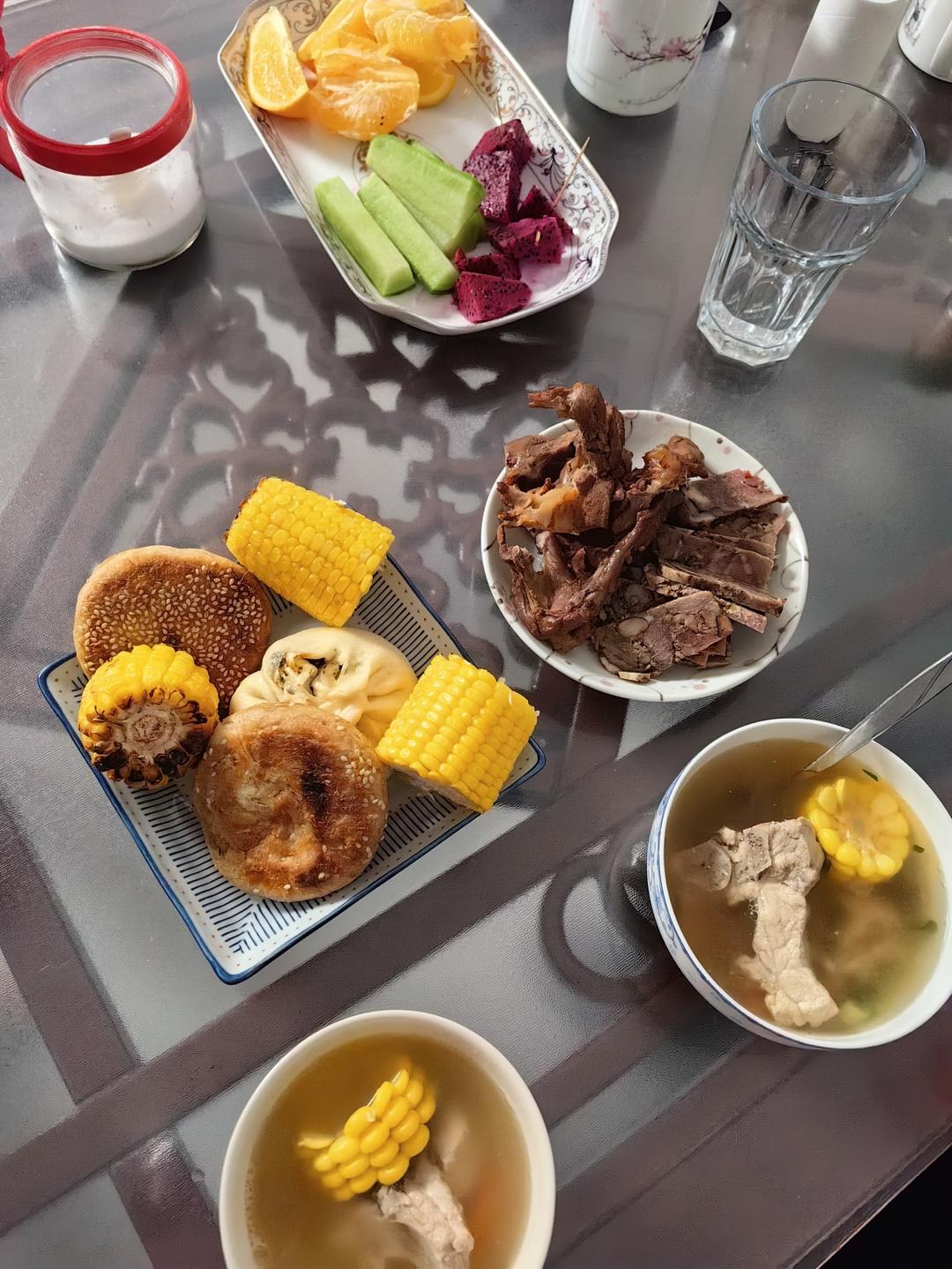 晚饭:排骨玉米汤,烤红薯玉米,熟食,