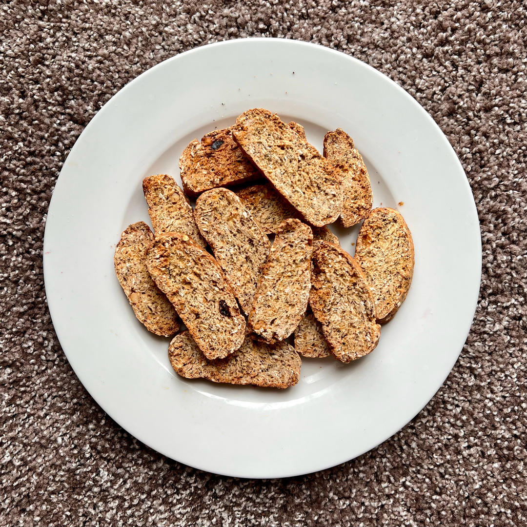 这次切得薄,是我做过最脆的脆饼🤣(比较有正宗biscotti的样子了)~很香,淳朴的味道,不是很甜。就是冷却后有点太硬了🙈磨牙棒的感觉……