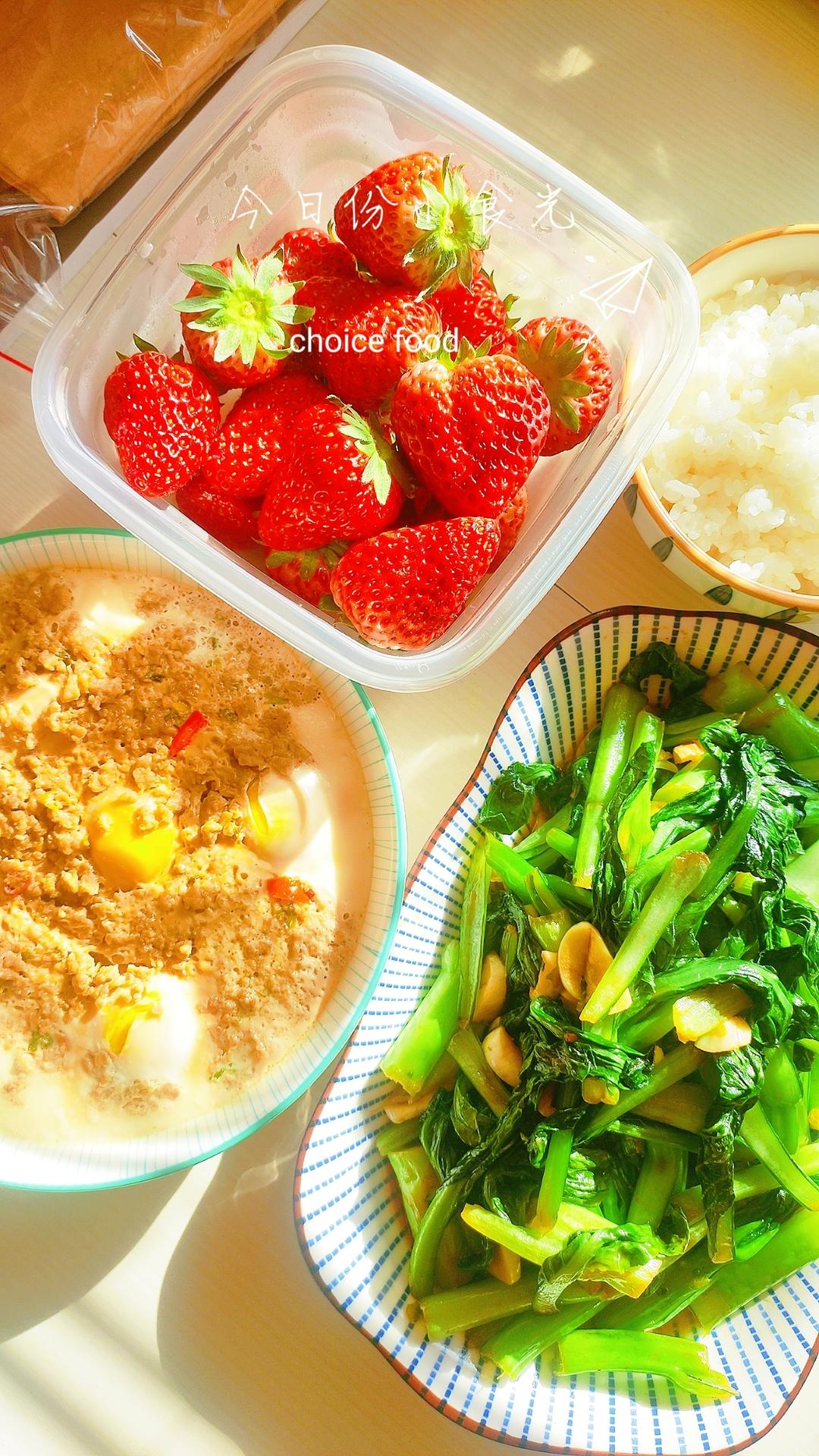 肉沫蒸蛋、素炒菜心、米饭🍚