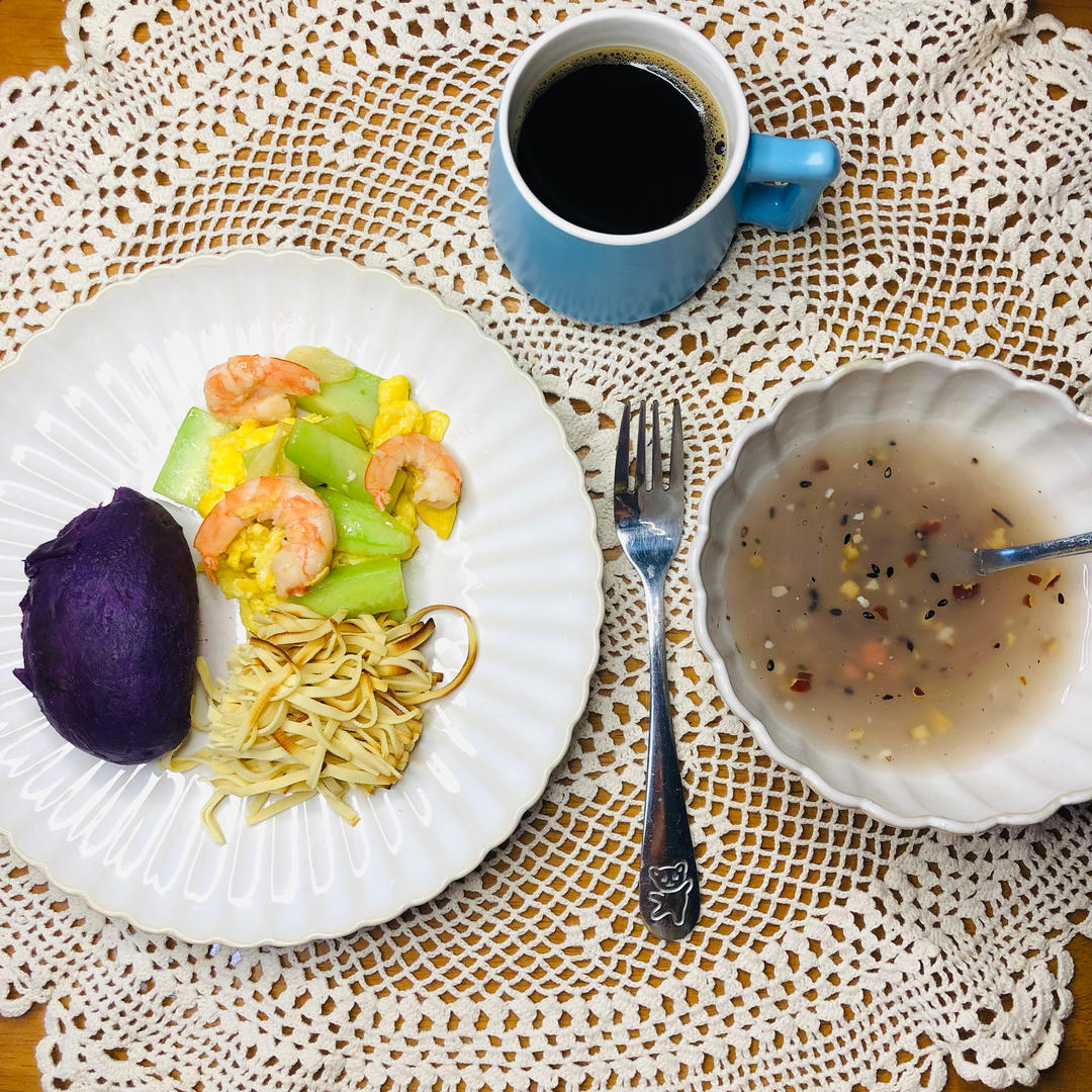 静女其姝-8912 做过 早餐•2024年1月17日 #早餐•2024年1月17日# 早安☀️🌹🍀今日早餐🍽🍀紫薯➕炒虾仁🍤鸡蛋🥚黄瓜🥒➕干🍀豆腐丝🍀坚果🌰藕粉🍀黑咖啡☕️🍀美好的一天从早餐开始了! 2024-01-17