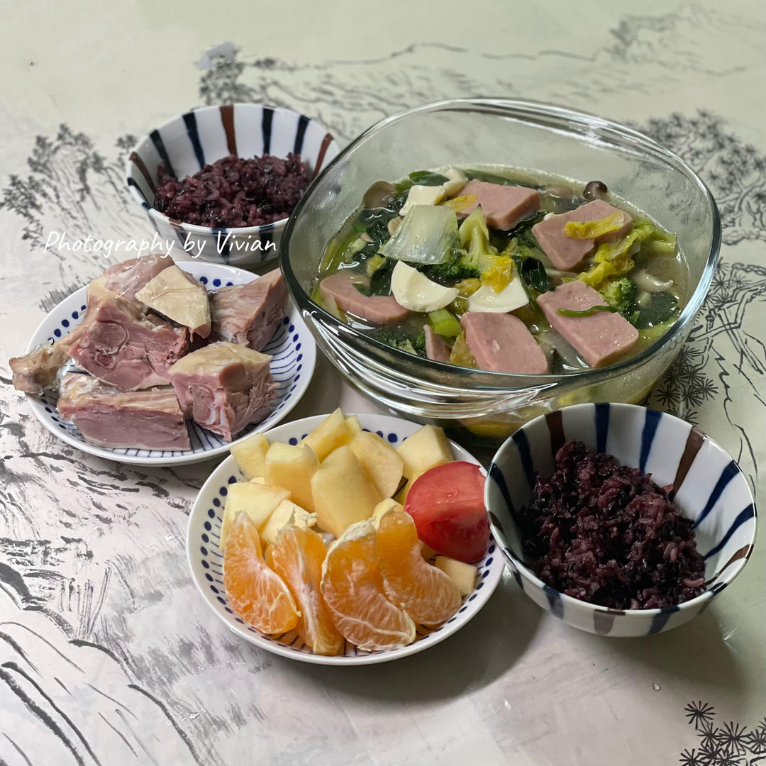 午晚餐|菌菇蛋白低温午晚餐时蔬大烩菜+桂花盐水鸭腿+黑米米饭+苹果橙小拼~🌷