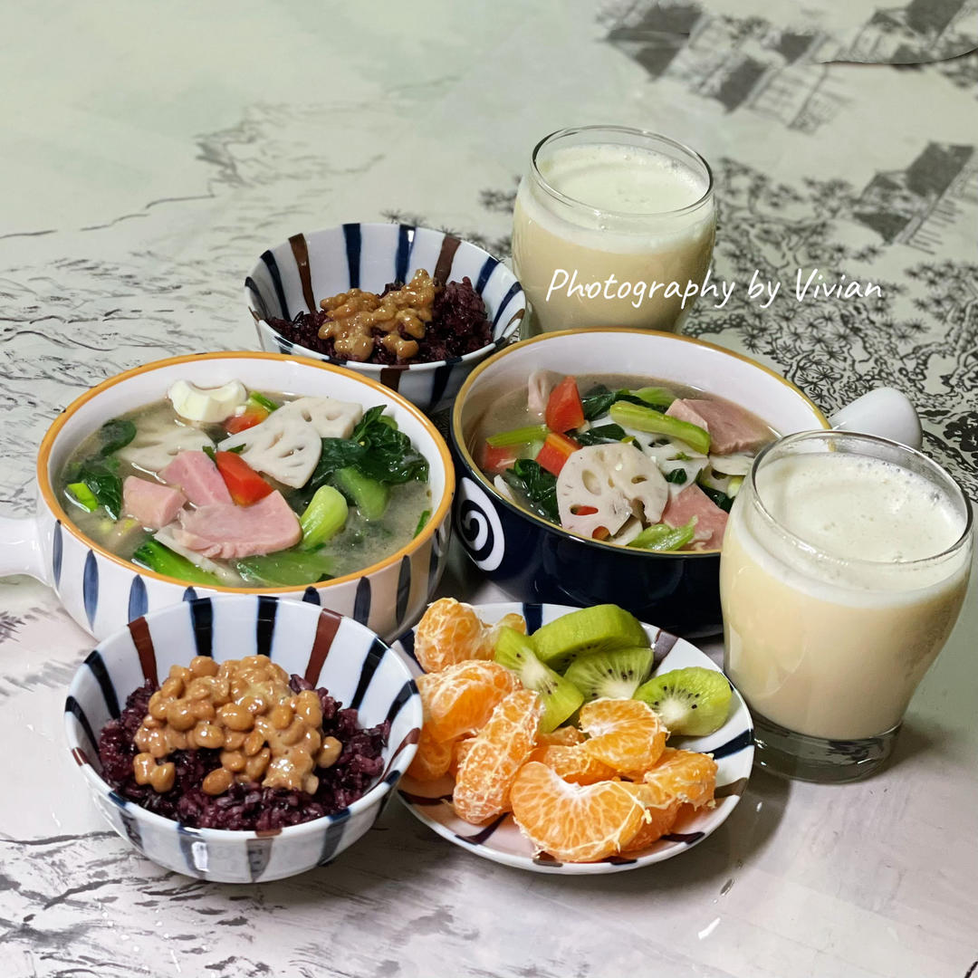 午晚餐|莲藕蛋白低温午晚餐时蔬大烩菜+纳豆黑米米饭+耙耙柑猕猴桃小拼+玉米豆浆~🌷