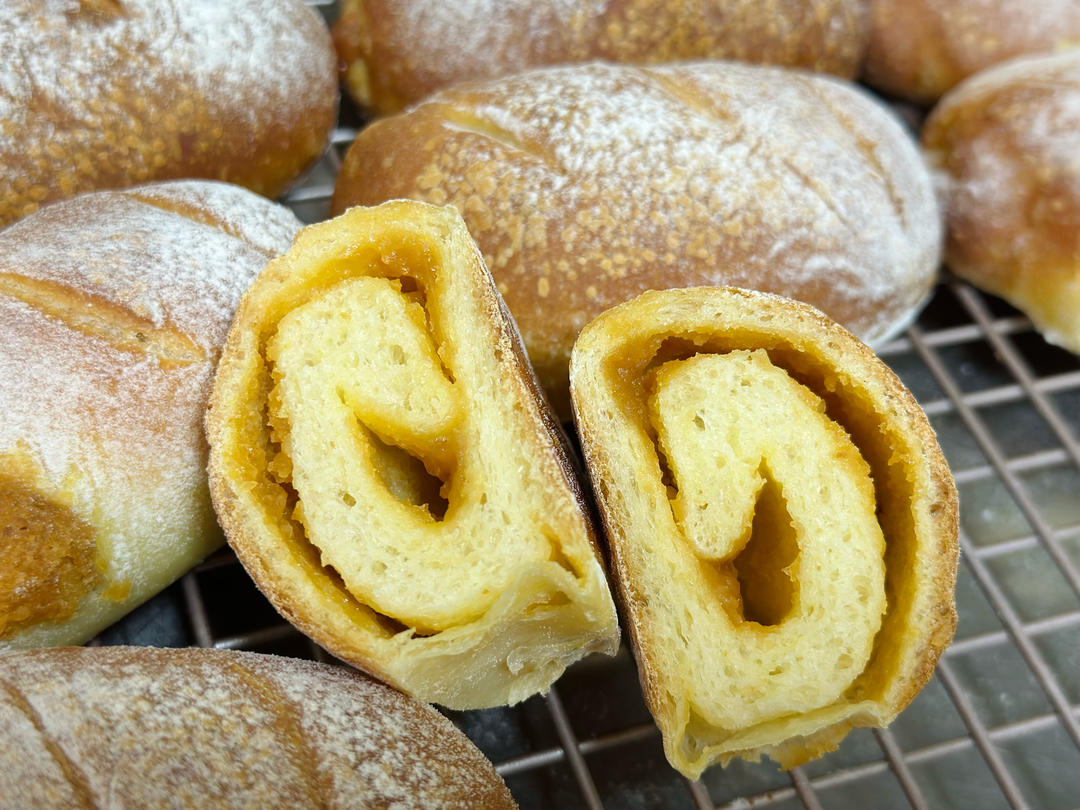 把月饼奶黄馅儿做成了奶黄餐包,味道也不错;芝麻奶酥也很香