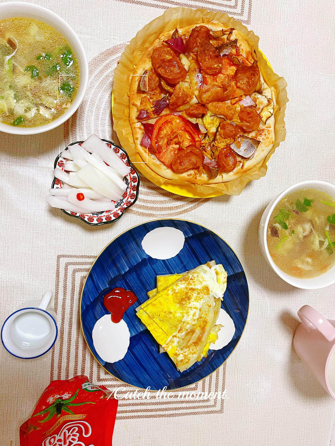 披萨+菌菇汤+手抓饼+小萝卜